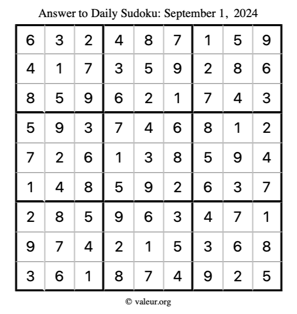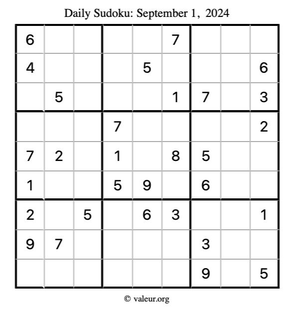 Here is the September 1, 2024 sudoku puzzle. You are welcome to print a copy to solve by hand. For your convenience, we have also included the solution further down the page so you can check your work.