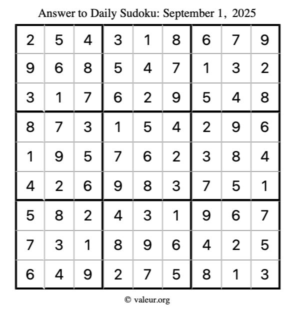 Here is the September 1, 2025 sudoku puzzle. You are welcome to print a copy to solve by hand. For your convenience, we have also included the solution further down the page so you can check your work.