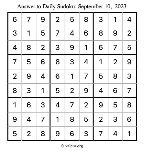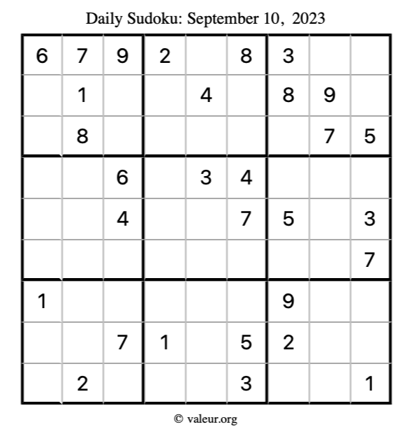 Here is the September 10, 2023 sudoku puzzle. You are welcome to print a copy to solve by hand. For your convenience, we have also included the solution further down the page so you can check your work.