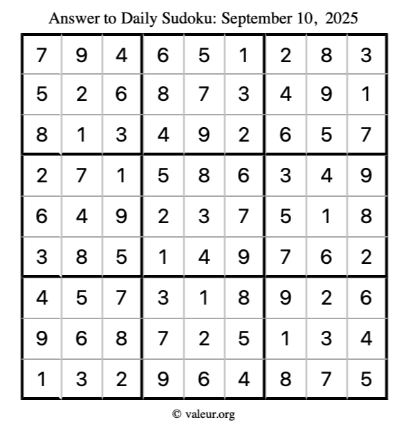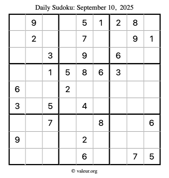 Here is the September 10, 2025 sudoku puzzle. You are welcome to print a copy to solve by hand. For your convenience, we have also included the solution further down the page so you can check your work.