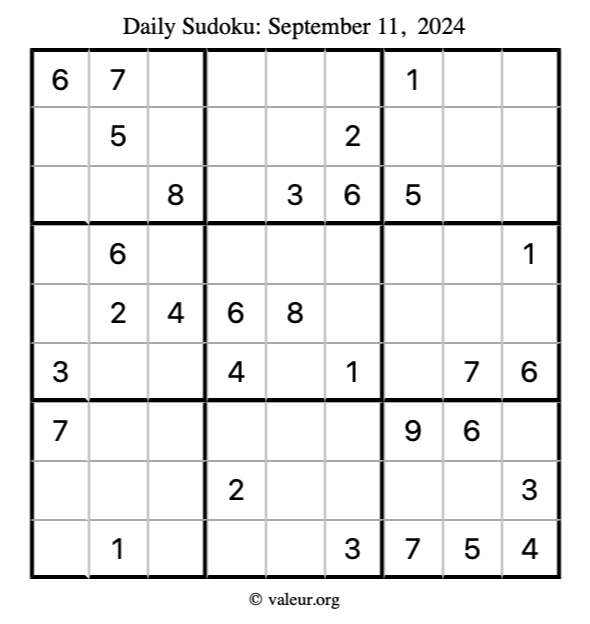 Here is the September 11, 2024 sudoku puzzle. You are welcome to print a copy to solve by hand. For your convenience, we have also included the solution further down the page so you can check your work.