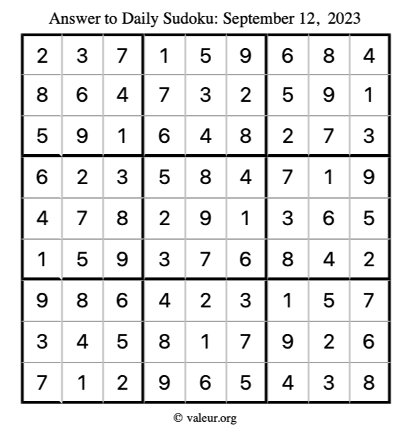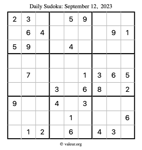 Here is the September 12, 2023 sudoku puzzle. You are welcome to print a copy to solve by hand. For your convenience, we have also included the solution further down the page so you can check your work.