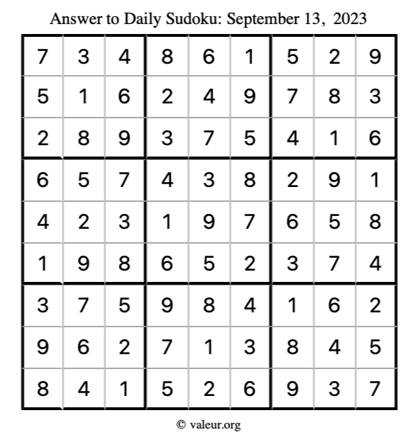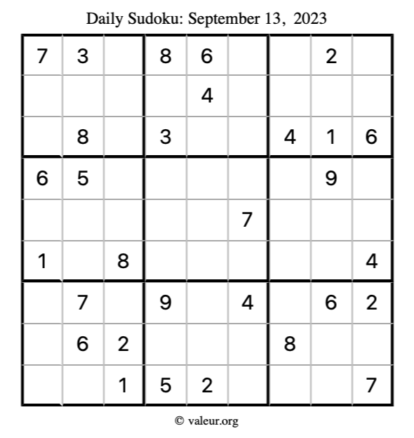 Here is the September 13, 2023 sudoku puzzle. You are welcome to print a copy to solve by hand. For your convenience, we have also included the solution further down the page so you can check your work.