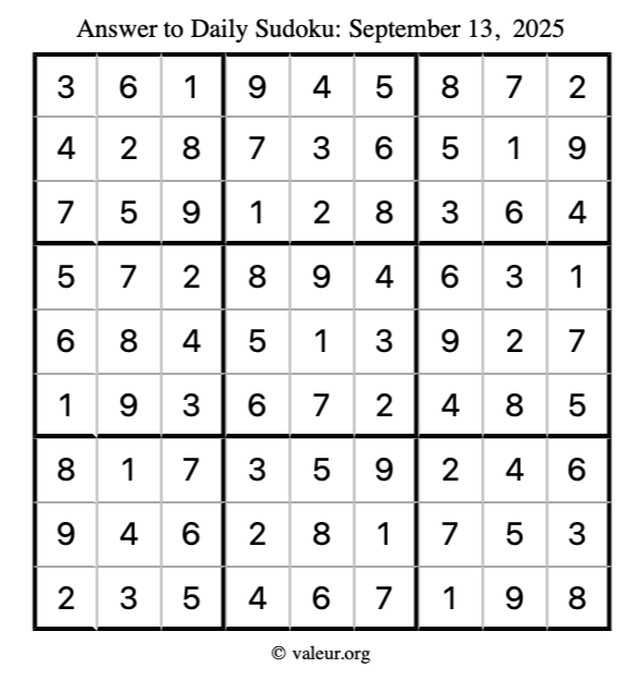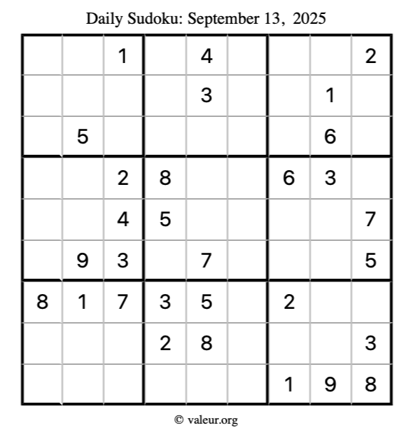 Here is the September 13, 2025 sudoku puzzle. You are welcome to print a copy to solve by hand. For your convenience, we have also included the solution further down the page so you can check your work.