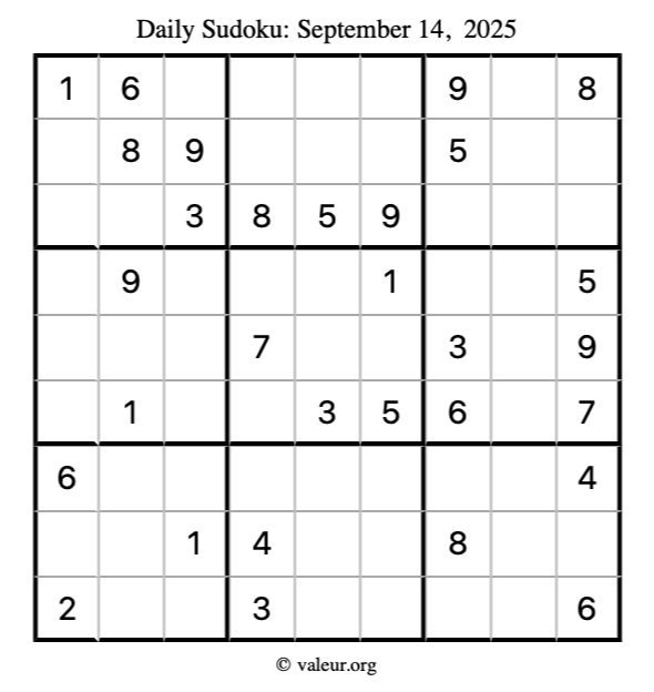 Here is the September 14, 2025 sudoku puzzle. You are welcome to print a copy to solve by hand. For your convenience, we have also included the solution further down the page so you can check your work.