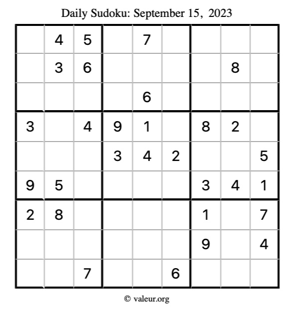 Here is the September 15, 2023 sudoku puzzle. You are welcome to print a copy to solve by hand. For your convenience, we have also included the solution further down the page so you can check your work.