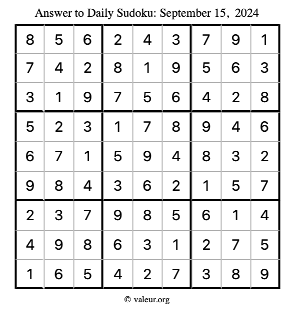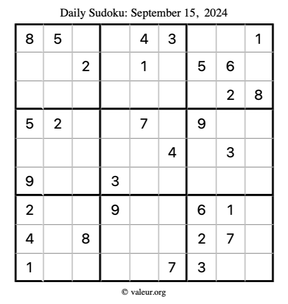Here is the September 15, 2024 sudoku puzzle. You are welcome to print a copy to solve by hand. For your convenience, we have also included the solution further down the page so you can check your work.