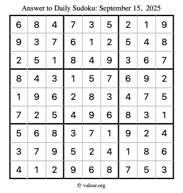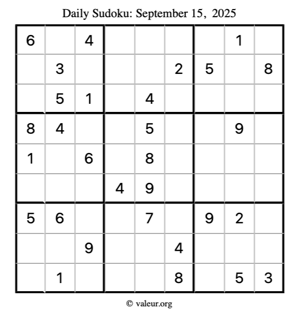 Here is the September 15, 2025 sudoku puzzle. You are welcome to print a copy to solve by hand. For your convenience, we have also included the solution further down the page so you can check your work.
