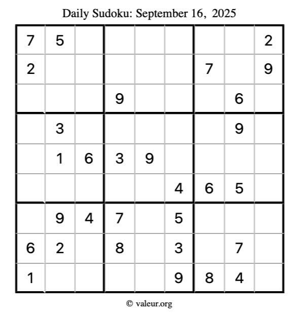 Here is the September 16, 2025 sudoku puzzle. You are welcome to print a copy to solve by hand. For your convenience, we have also included the solution further down the page so you can check your work.