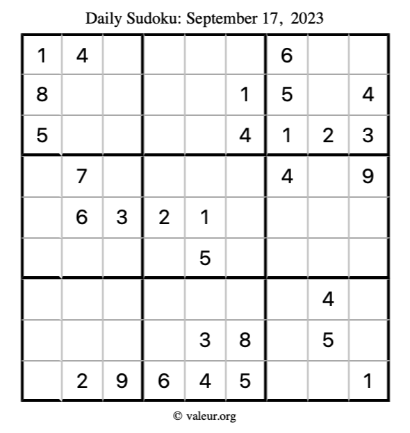 Here is the September 17, 2023 sudoku puzzle. You are welcome to print a copy to solve by hand. For your convenience, we have also included the solution further down the page so you can check your work.
