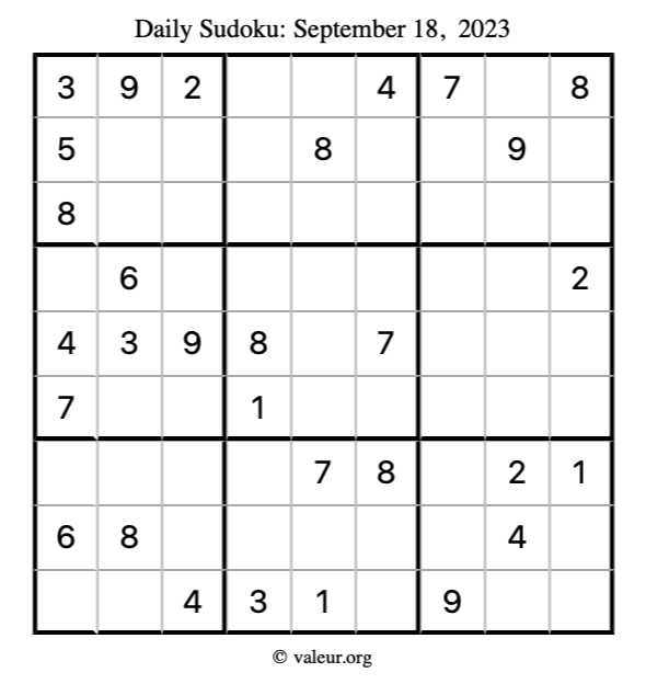 Here is the September 18, 2023 sudoku puzzle. You are welcome to print a copy to solve by hand. For your convenience, we have also included the solution further down the page so you can check your work.