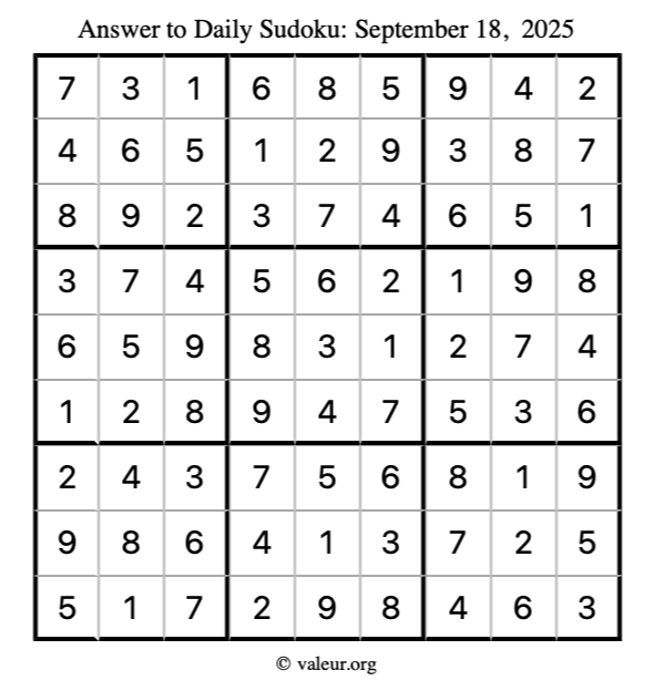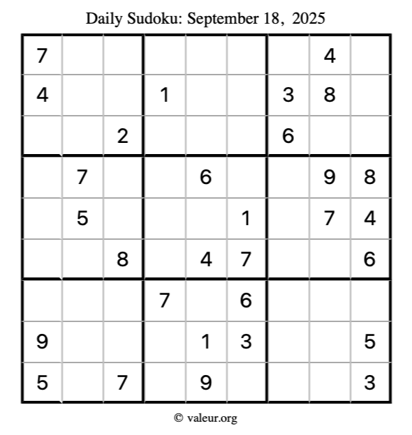 Here is the September 18, 2025 sudoku puzzle. You are welcome to print a copy to solve by hand. For your convenience, we have also included the solution further down the page so you can check your work.