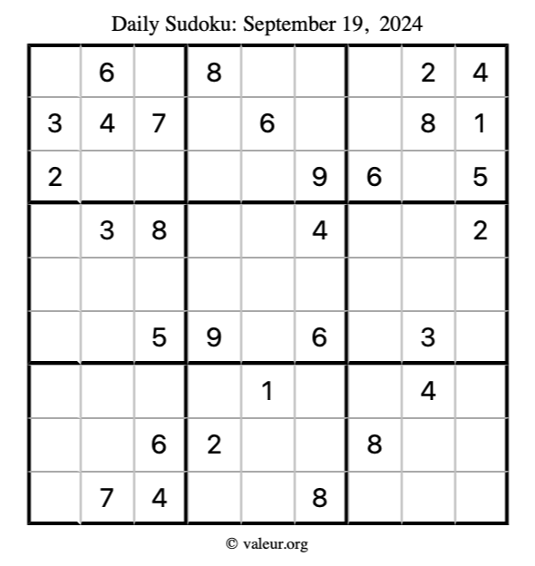 Here is the September 19, 2024 sudoku puzzle. You are welcome to print a copy to solve by hand. For your convenience, we have also included the solution further down the page so you can check your work.