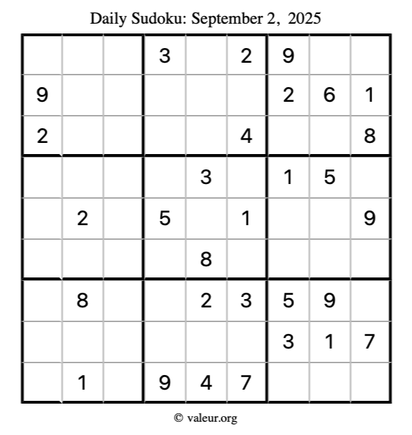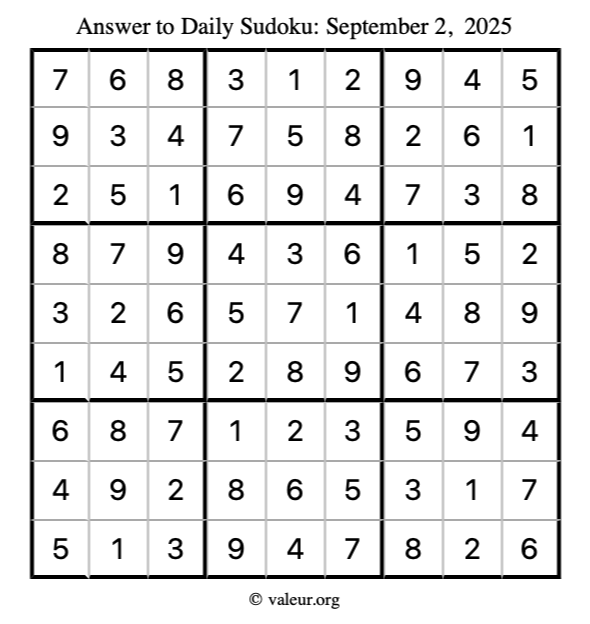 Here is the September 2, 2025 sudoku puzzle. You are welcome to print a copy to solve by hand. For your convenience, we have also included the solution further down the page so you can check your work.