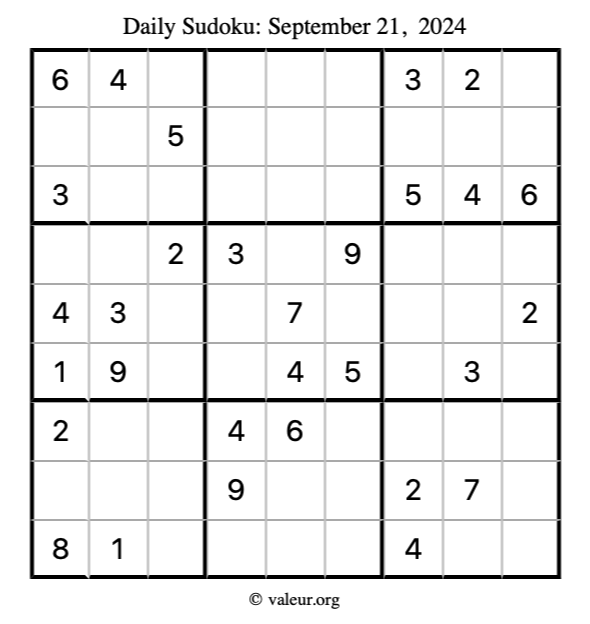 Here is the September 21, 2024 sudoku puzzle. You are welcome to print a copy to solve by hand. For your convenience, we have also included the solution further down the page so you can check your work.