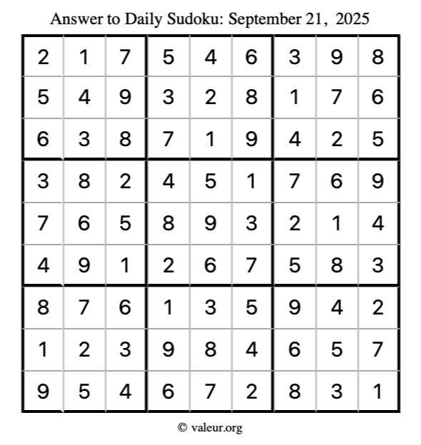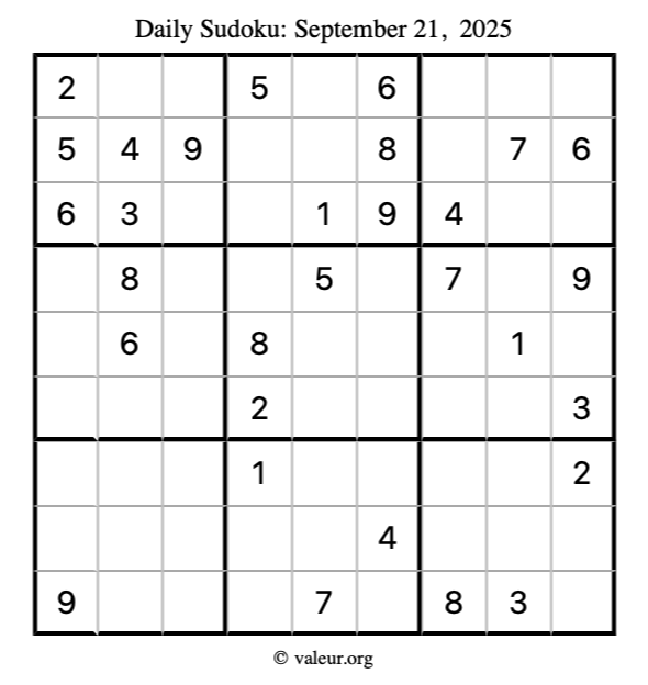 Here is the September 21, 2025 sudoku puzzle. You are welcome to print a copy to solve by hand. For your convenience, we have also included the solution further down the page so you can check your work.