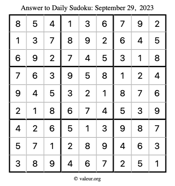 Here is the September 29, 2023 sudoku puzzle. You are welcome to print a copy to solve by hand. For your convenience, we have also included the solution further down the page so you can check your work.