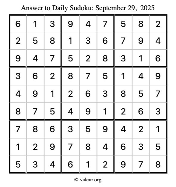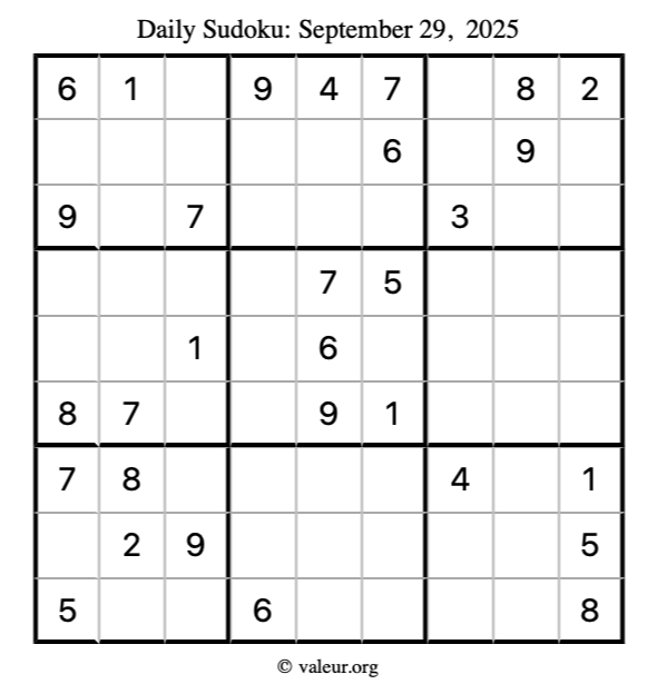 Here is the September 29, 2025 sudoku puzzle. You are welcome to print a copy to solve by hand. For your convenience, we have also included the solution further down the page so you can check your work.