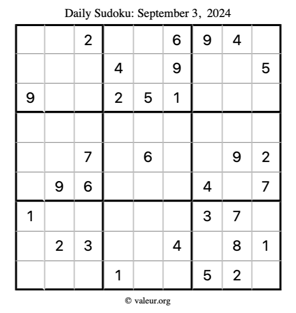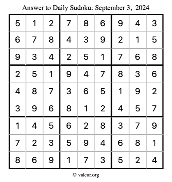Here is the September 3, 2024 sudoku puzzle. You are welcome to print a copy to solve by hand. For your convenience, we have also included the solution further down the page so you can check your work.