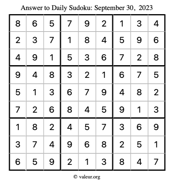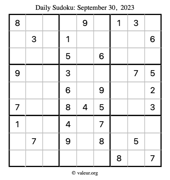 Here is the September 30, 2023 sudoku puzzle. You are welcome to print a copy to solve by hand. For your convenience, we have also included the solution further down the page so you can check your work.