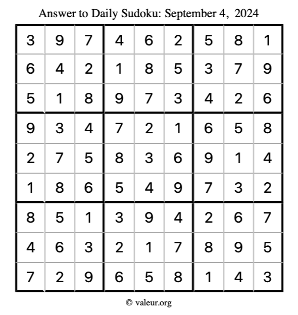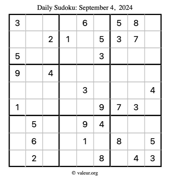 Here is the September 4, 2024 sudoku puzzle. You are welcome to print a copy to solve by hand. For your convenience, we have also included the solution further down the page so you can check your work.