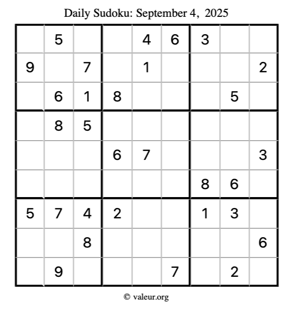 Here is the September 4, 2025 sudoku puzzle. You are welcome to print a copy to solve by hand. For your convenience, we have also included the solution further down the page so you can check your work.