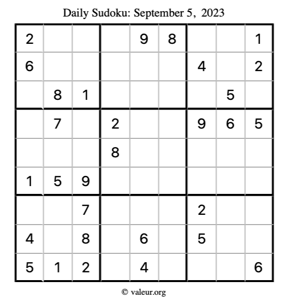 Here is the September 5, 2023 sudoku puzzle. You are welcome to print a copy to solve by hand. For your convenience, we have also included the solution further down the page so you can check your work.