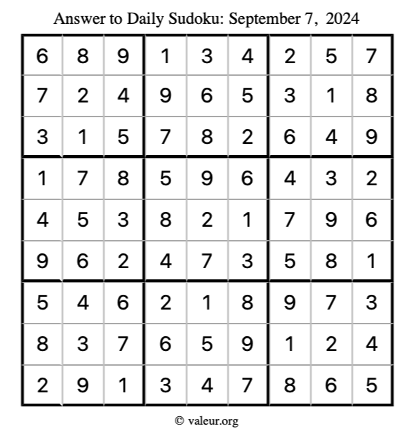 Here is the September 7, 2024 sudoku puzzle. You are welcome to print a copy to solve by hand. For your convenience, we have also included the solution further down the page so you can check your work.