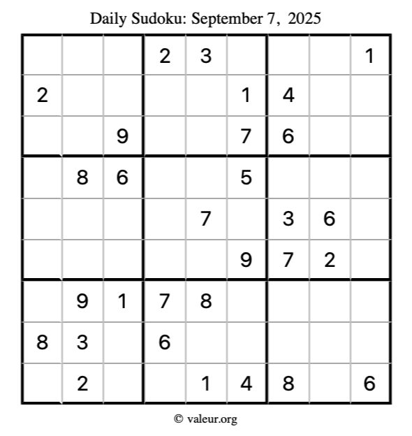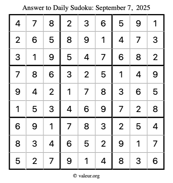 Here is the September 7, 2025 sudoku puzzle. You are welcome to print a copy to solve by hand. For your convenience, we have also included the solution further down the page so you can check your work.