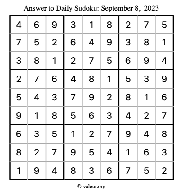 Here is the September 8, 2023 sudoku puzzle. You are welcome to print a copy to solve by hand. For your convenience, we have also included the solution further down the page so you can check your work.