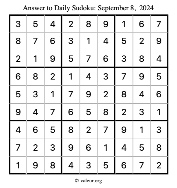 Here is the September 8, 2024 sudoku puzzle. You are welcome to print a copy to solve by hand. For your convenience, we have also included the solution further down the page so you can check your work.