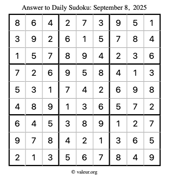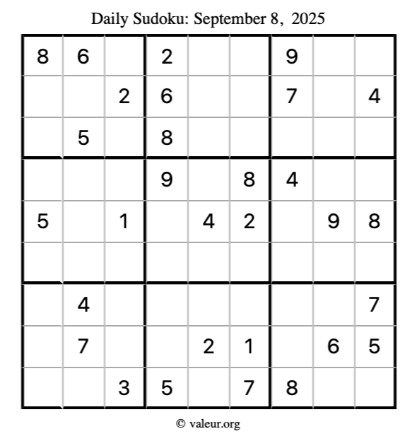 Here is the September 8, 2025 sudoku puzzle. You are welcome to print a copy to solve by hand. For your convenience, we have also included the solution further down the page so you can check your work.