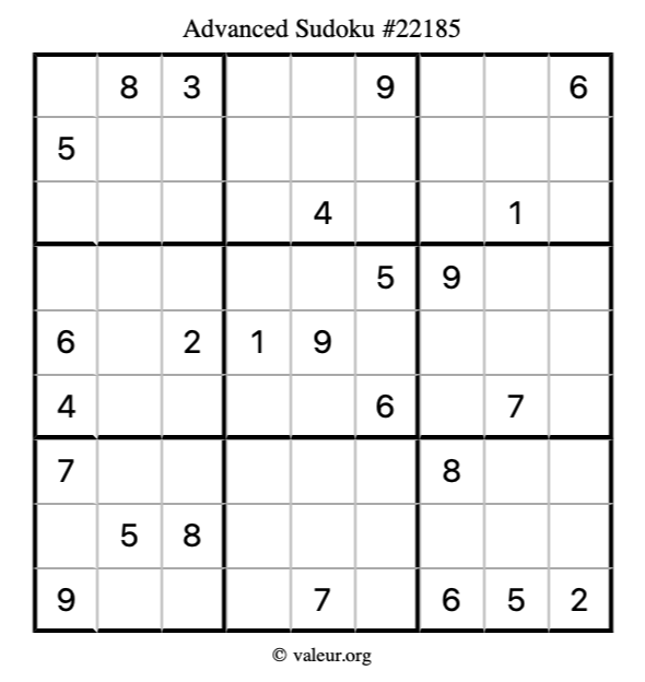 Here is our printable Advanced Sudoku Puzzle #22185. You are welcome to print a copy for yourself and solve it the old-fashioned way with a pencil and an eraser!