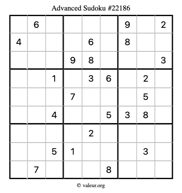 Here is our printable Advanced Sudoku Puzzle #22186. You are welcome to print a copy for yourself and solve it the old-fashioned way with a pencil and an eraser!