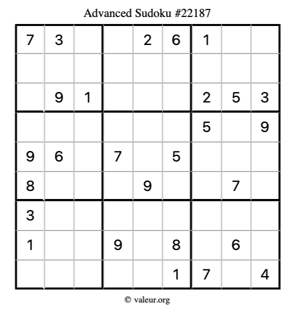 Here is our printable Advanced Sudoku Puzzle #22187. You are welcome to print a copy for yourself and solve it the old-fashioned way with a pencil and an eraser!