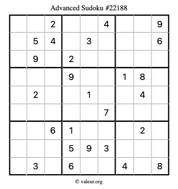 Here is our printable Advanced Sudoku Puzzle #22188. You are welcome to print a copy for yourself and solve it the old-fashioned way with a pencil and an eraser!