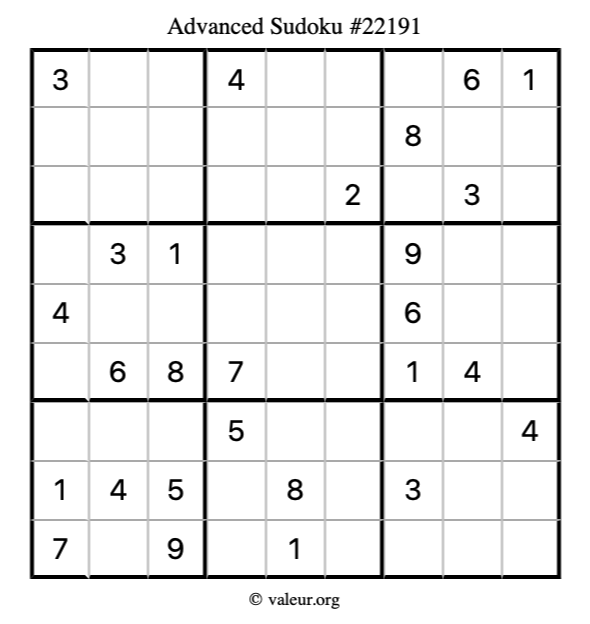 Here is our printable Advanced Sudoku Puzzle #22191. You are welcome to print a copy for yourself and solve it the old-fashioned way with a pencil and an eraser!