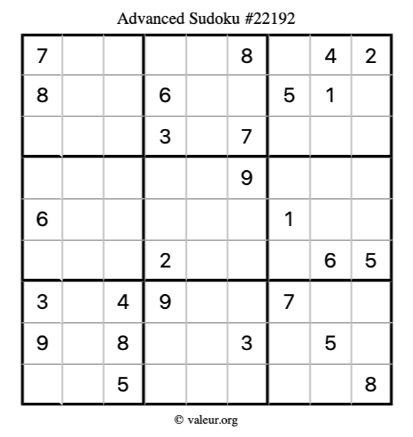 Advanced Sudoku puzzle #22192 is not the only advanced Sudoku puzzle in our database. We have thousands of advanced Sudoku puzzles that you can print and solve. Check them out here!