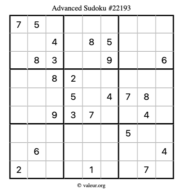 Here is our printable Advanced Sudoku Puzzle #22193. You are welcome to print a copy for yourself and solve it the old-fashioned way with a pencil and an eraser!