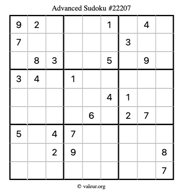 Here is our printable Advanced Sudoku Puzzle #22207. You are welcome to print a copy for yourself and solve it the old-fashioned way with a pencil and an eraser!