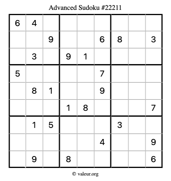 Here is our printable Advanced Sudoku Puzzle #22211. You are welcome to print a copy for yourself and solve it the old-fashioned way with a pencil and an eraser!