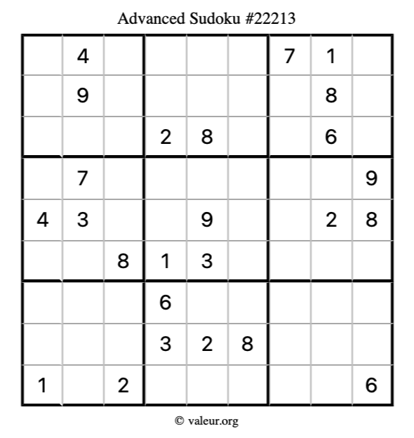 Here is our printable Advanced Sudoku Puzzle #22213. You are welcome to print a copy for yourself and solve it the old-fashioned way with a pencil and an eraser!