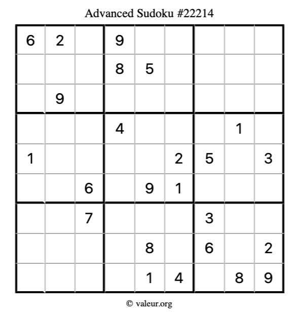Here is our printable Advanced Sudoku Puzzle #22214. You are welcome to print a copy for yourself and solve it the old-fashioned way with a pencil and an eraser!