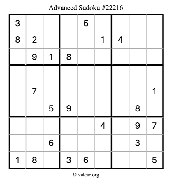 Here is our printable Advanced Sudoku Puzzle #22216. You are welcome to print a copy for yourself and solve it the old-fashioned way with a pencil and an eraser!