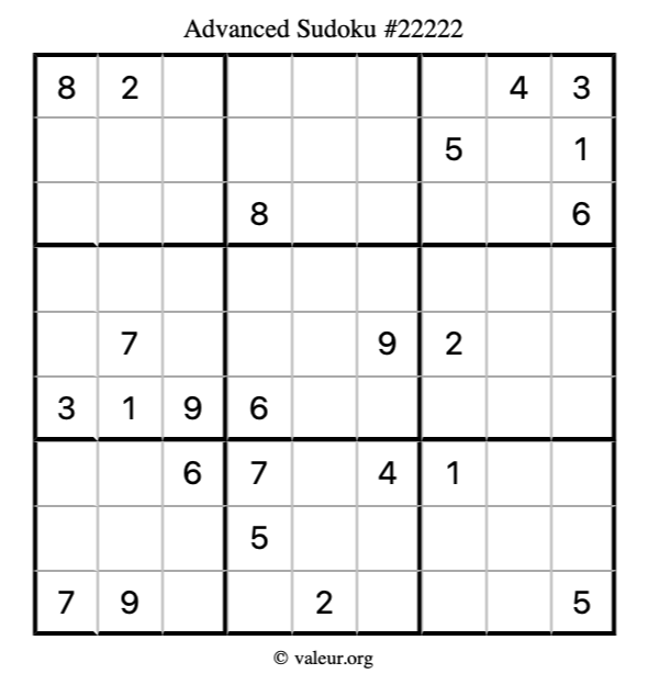 Here is our printable Advanced Sudoku Puzzle #22222. You are welcome to print a copy for yourself and solve it the old-fashioned way with a pencil and an eraser!