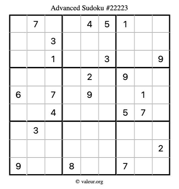 Here is our printable Advanced Sudoku Puzzle #22223. You are welcome to print a copy for yourself and solve it the old-fashioned way with a pencil and an eraser!