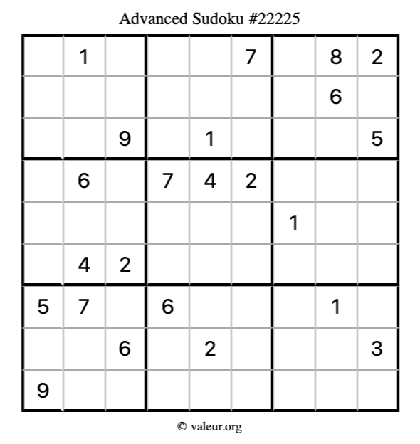 Here is our printable Advanced Sudoku Puzzle #22225. You are welcome to print a copy for yourself and solve it the old-fashioned way with a pencil and an eraser!