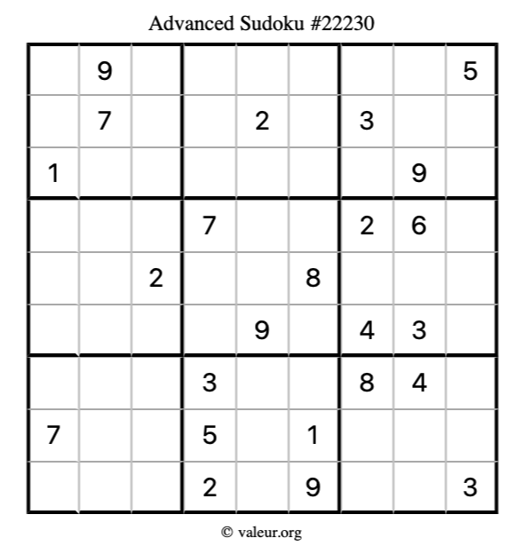 Here is our printable Advanced Sudoku Puzzle #22230. You are welcome to print a copy for yourself and solve it the old-fashioned way with a pencil and an eraser!
