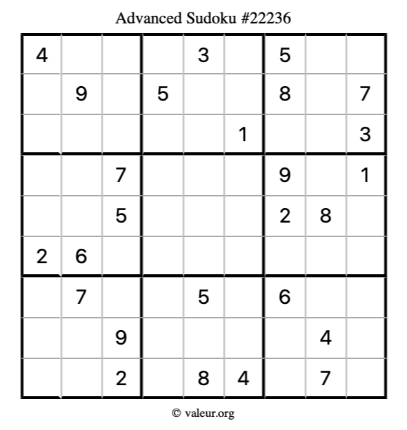 Here is our printable Advanced Sudoku Puzzle #22236. You are welcome to print a copy for yourself and solve it the old-fashioned way with a pencil and an eraser!