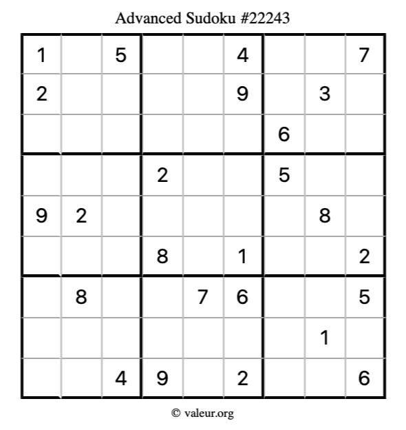 Here is our printable Advanced Sudoku Puzzle #22243. You are welcome to print a copy for yourself and solve it the old-fashioned way with a pencil and an eraser!
